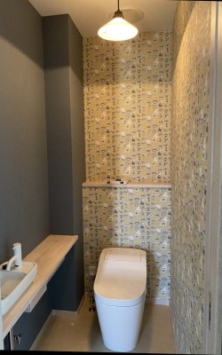 トイレには、ムーミングッズを飾る棚とムーミンの柄の壁クロス。