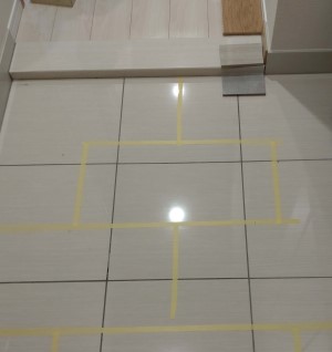 玄関タイルの割り付け・・・目地位置をテープで貼ってみて確認したり・・・