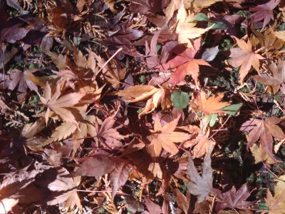 少し歩くと苔の上に広がる散って重なる紅葉。