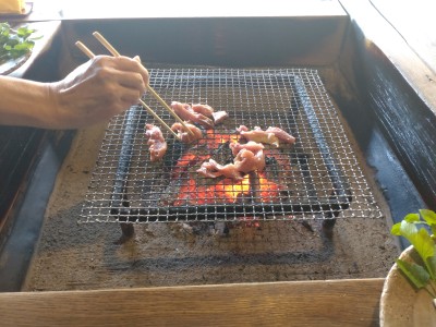 ゆっくりと地鶏がいい加減に焼けて、その煙と音と香りに