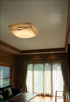 折り上げ天井には艶やかな布クロス。LEDの照明器具の上向きの光。