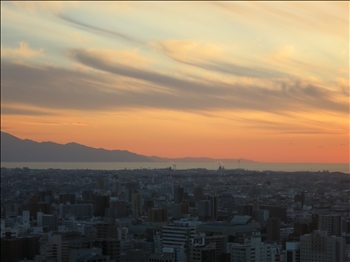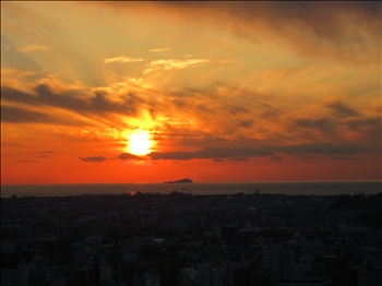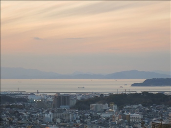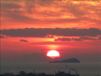 夕日を浴びて、九州の半島?のシルエットが浮かんでいました。