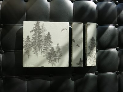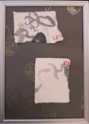 右下:深い紫の紙クロスに書の和紙をコラージュされています。