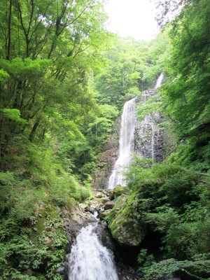山道を川沿いに歩けば、滝に着きます。