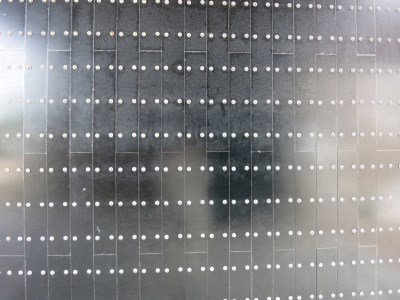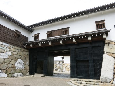 黒い門は鉄御門(くろがねごもん)。全面木部全体に3mmの黒い鉄板を鋲で打ち付けた力強い門です。
