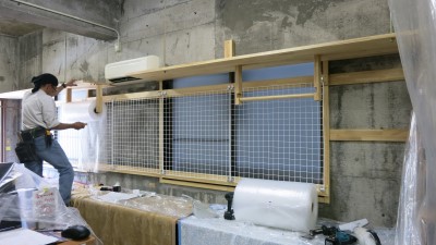 壁面の窓から窓いっぱいにメッシュパネルが、取り付けられました。