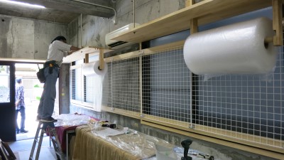 プチプチの梱包材も棚下に、木の質感をいかした細工で取付られました。