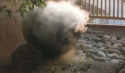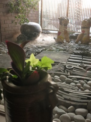 ドライアイスで玄関正面の備前の花器を冷やしてみました。
