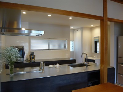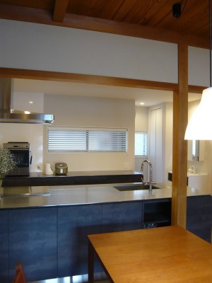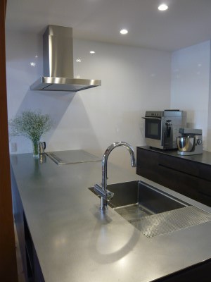 ステンレスのモダンなカウンタ―キッチン。奥行も深く、ひろく。山田別注ステンレスさんのお仕事です。