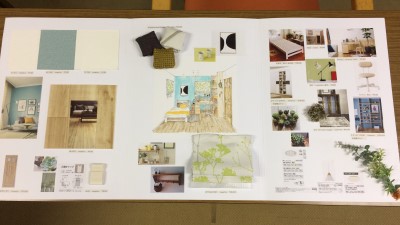 受講者の皆様の実技試験(コンセプト設定・インテリアエレメントの選択・パース作成・ボード製作)、