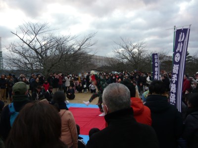 獅子舞の周りに人だかり。