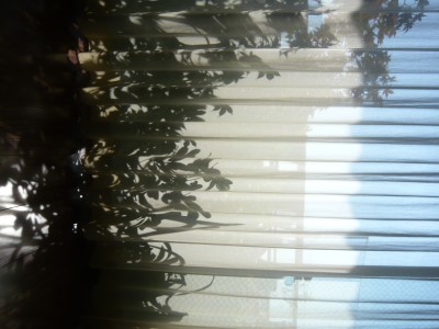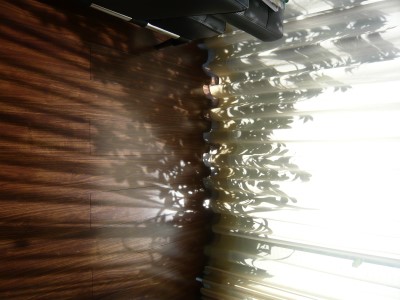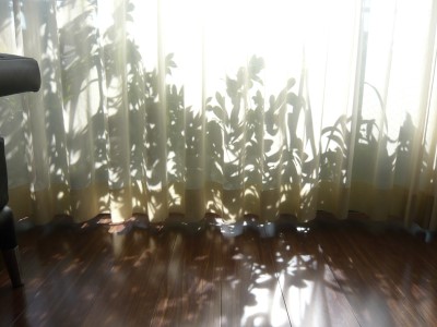 レースにバルコニーの鉢植えの葉の影が映って、揺れて、穏やかな朝。