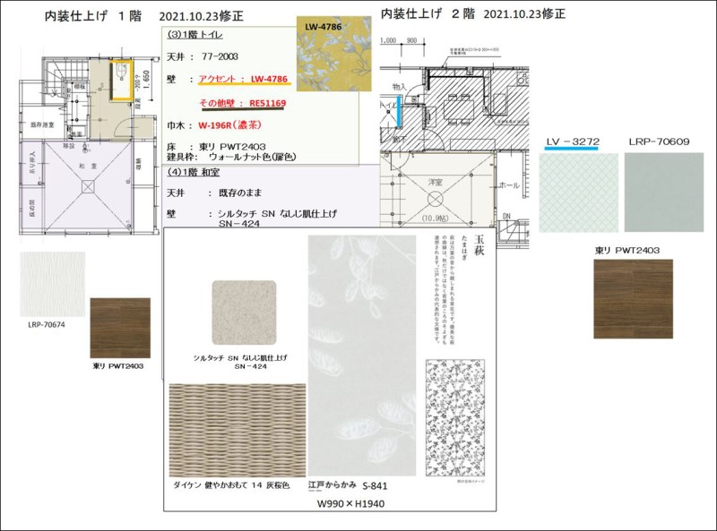 工事の内容、トイレの選定、内装計画リビングのソファ、照明計画、TV位置の変更、