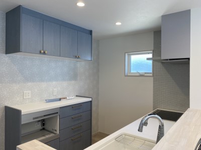 キッチンのタイルはキッチン扉の色に合わせて青みがかったグレー。