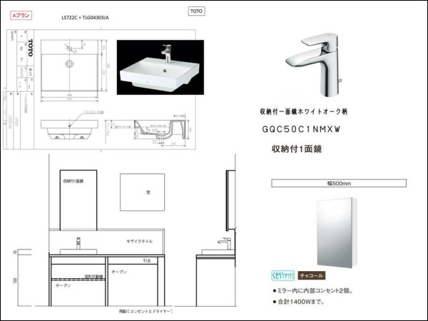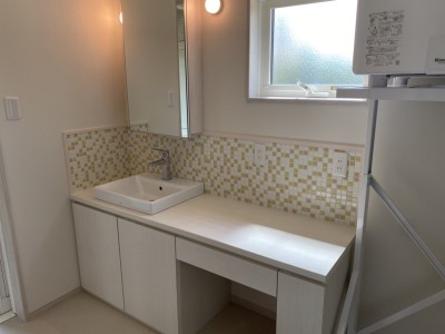 シンク、水栓。ミラー収納、カウンター・・・座ってお化粧もできます。