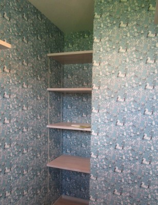 トイレには、ムーミングッズを飾る棚とムーミンの柄の壁クロス。