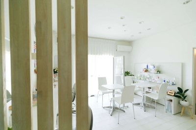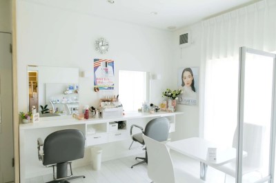 白を基調とし、爽やかで優しさにあふれる内装のメイクコーナー・コンサルティングコーナー。