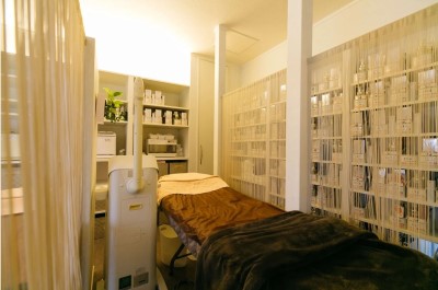 エステベッドを緩やかにラインドロップカーテンで仕切り、
