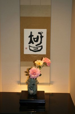 奥様の作品、書の掛軸。 丹精に育てられた季節の花。