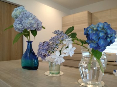 またいろんな種類の紫陽花も、自由なガラスの花器グルーピング。