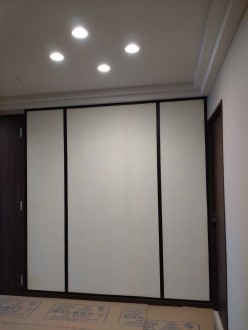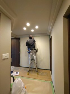 パネル壁を照らすダウンライト、その位置と向きの調整・・・難しい作業が残っています。