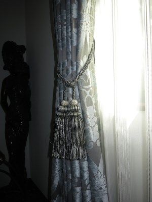 カーテンはシックに。ドレープは大胆な大柄の古典柄。レースには微妙なグラデーションのあるラインがモダンです。